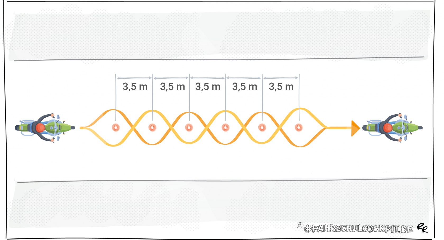 Inhalt der Grundfahraufgabe: Der Fahrschüler muss eine Slalomstrecke aus 6 Leitkegeln mit jeweils 3,5 m Abstand in Schrittgeschwindigkeit (etwa 5 km/h im 1. Gang) durchfahren. Dabei ist das Gleichgewicht zu halten sowie Kupplung, Gas und Bremse korrekt zu bedienen.