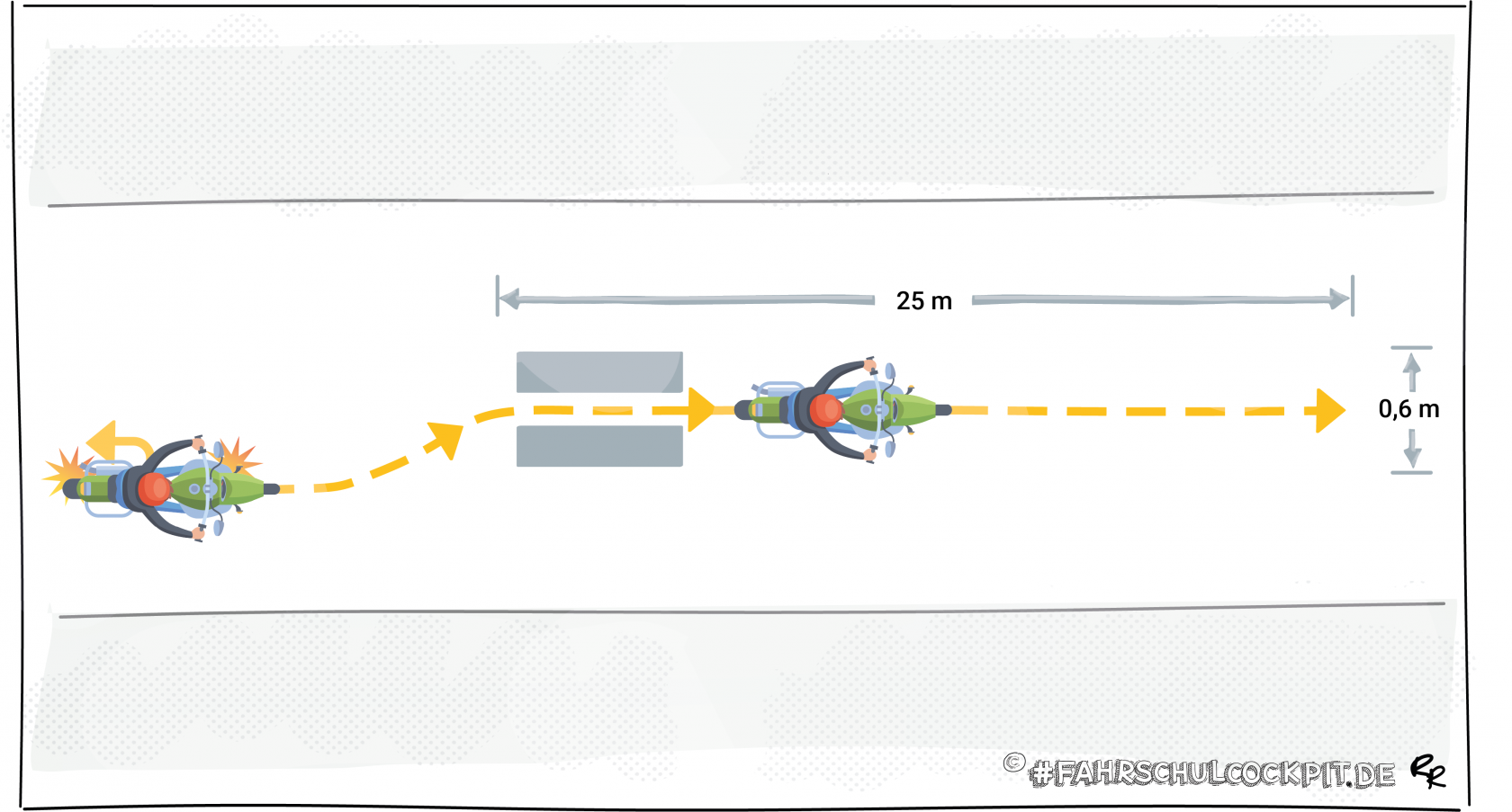 Der Fahrschüler fährt eine Strecke von etwa 25 m in Schrittgeschwindigkeit geradeaus. Dabei muss er das Gleichgewicht halten und Kupplung, Gas sowie Bremse korrekt bedienen.